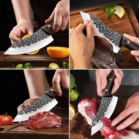 Kenji always valued a knife that could handle anything, whether in a professional kitchen or an outdoor barbecue. This full-tang, hand-forged butcher knife is built for power and precision, featuring a razor-sharp high-carbon steel blade and a sturdy wenge wood handle.
